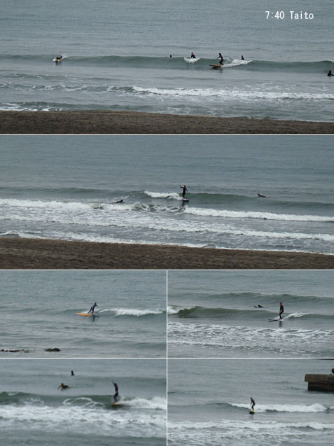 7:40の情報 天候:雲り 風:北〜北西(弱)〜無風 波:〜モモ腰 ウエット:3m/mフルスーツ〜 人数:太東〜シーイーグル間人(堤防5、正面10、シーイーグル5)