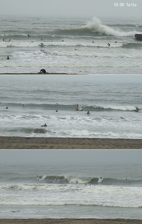 10:00の情報 天候:雲り 風:東(弱) 波:〜肩頭 ウエット:3m/mフルスーツ〜 人数:太東〜シーイーグル間 130人(提70、正面30、シーイーグル30)