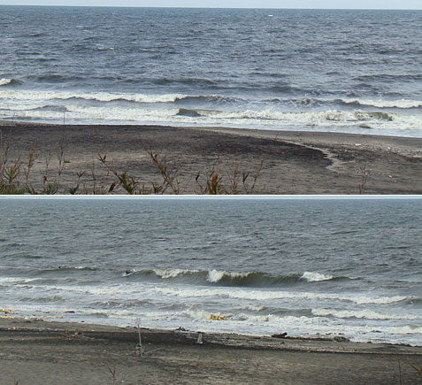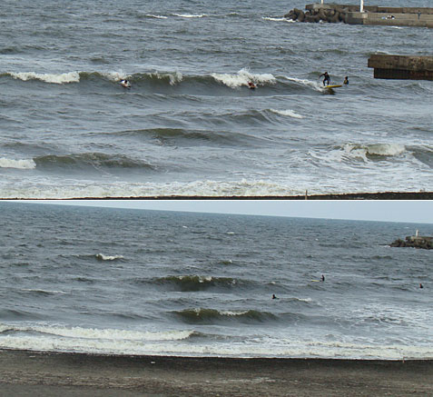 風が強くなると風に対してのビーチの向きによって波質が変化します。