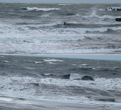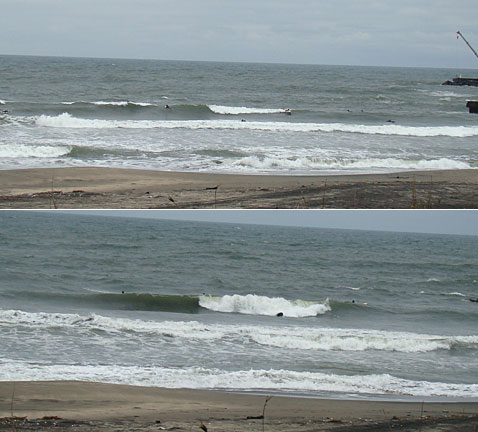 冷静に見るとこんな状態でも堤防横はコンスタントに乗れる波は来ています。