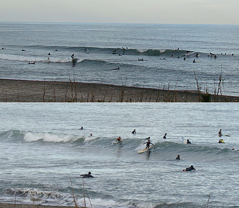 セットでなくても、水が多そうで厚めな波が、岸よりの棚で割れるのが最もホローして来てました。