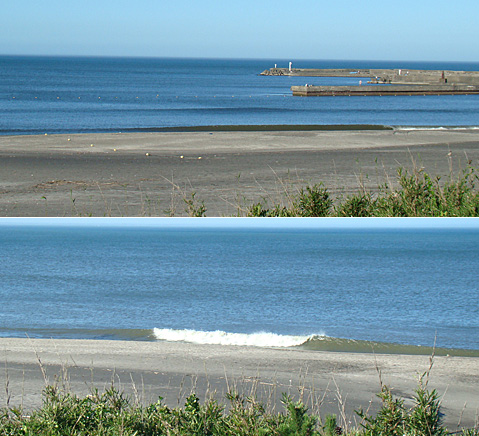 ここと堤防横で風の影響が違うほど湾曲した海岸線です。