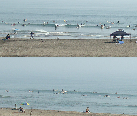 ロープより奥でモモくらいの波が割れてます。