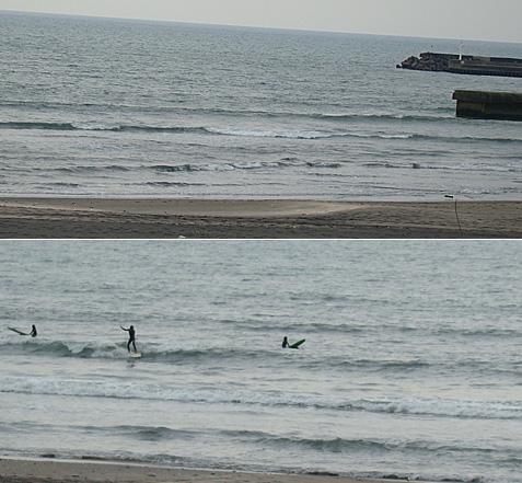 引きが大きい昼間に風が入って、小さくて力の無い波はロングボードでないと