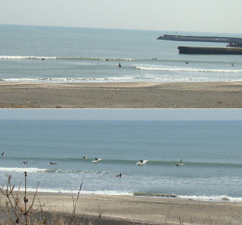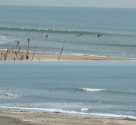 引きが大きい昼間に風が入って、小さくて力の無い波はロングボードでないと