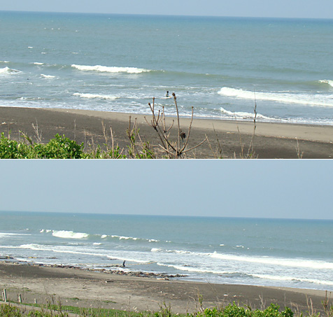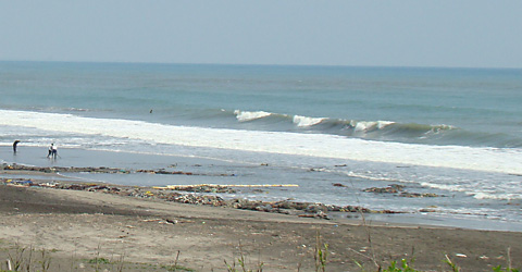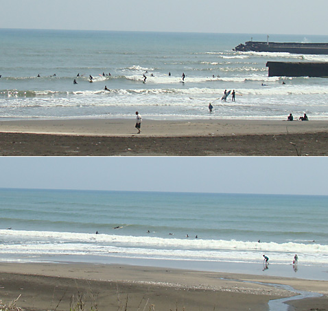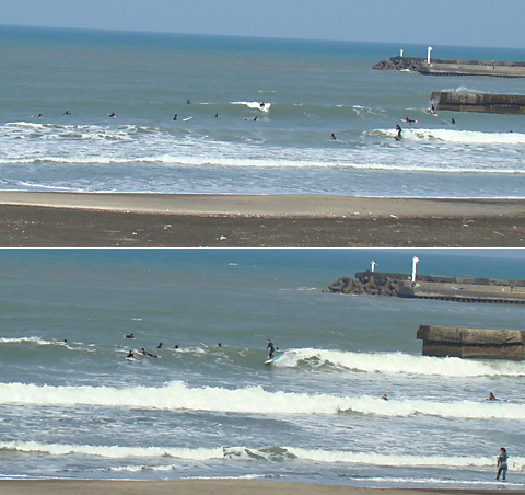 そして吹いている南東の風の影響で波のトップも崩れています。