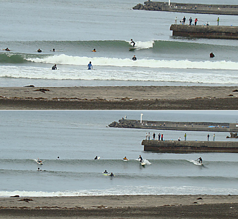 太東堤防付近、腰前後の形の良い波がブレイクしています。