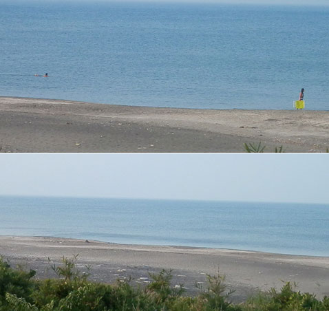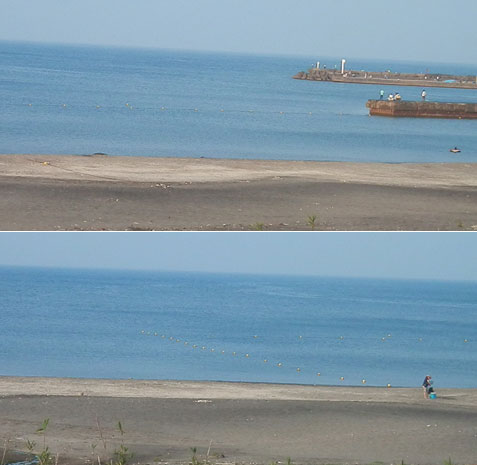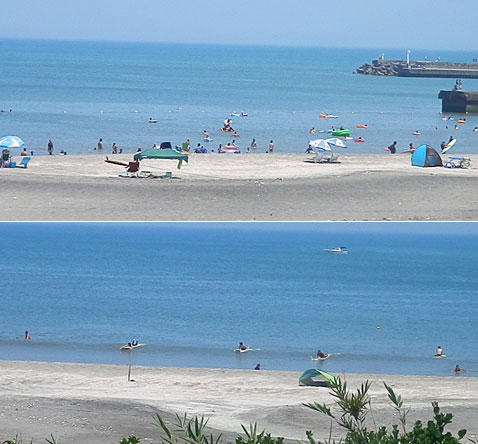 海水浴での浮き輪、ボールが沖へドンドン流されて行きます。