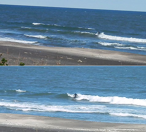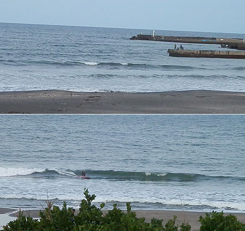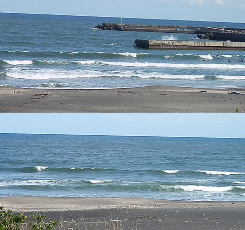 朝8時頃の引きの時間の堤防横の波打ち際です。少し掘れて、砂のバンクが出来てしまっています。