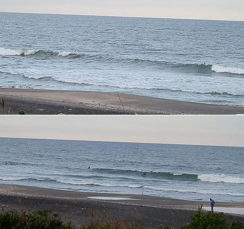 朝の8時前。面はクリーン。腰サイズ。堤防横1人。正面1人、そして少し左に1人。