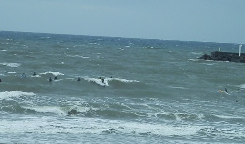 それでも緩いオンショアの波は、慣れてないと乗れないようです。